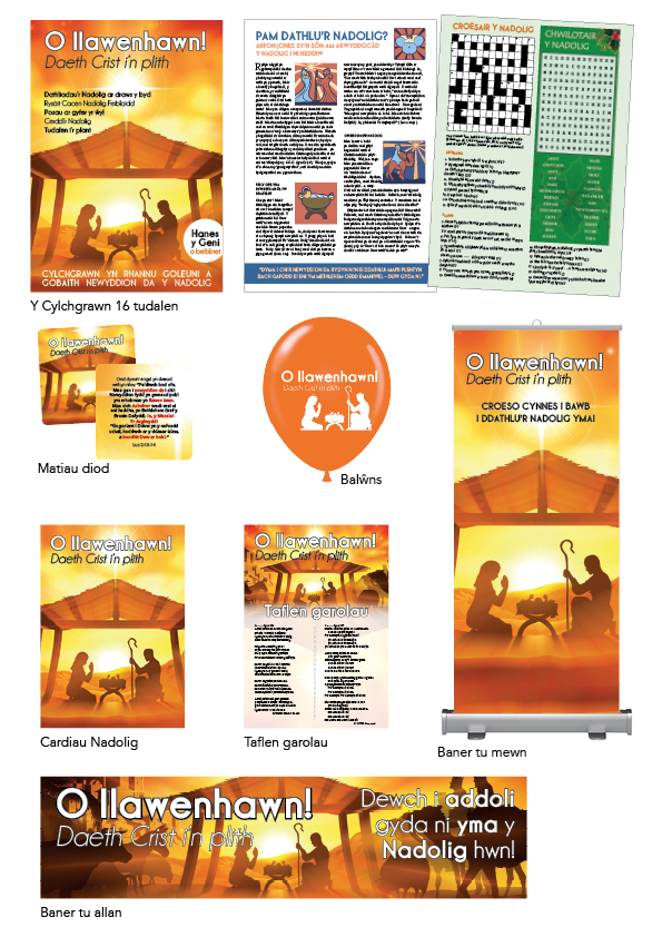 Yn ogystal hefyd mae baner liwgar ar gyfer ei harddangos tu allan i’ch capel (2 fedr wrth 0.5 medr) ar gael am £25 yr un. Neu faner tu mewn (roller banner) am £50 yr un. Hefyd mae taflenni carolau ar gael am £30 (pecyn o 100), balŵns lliwgar am £2 (pecyn o 10) a matiau diod am £2 (pecyn o 10). Mae cardiau Nadolig hefyd ar gael yn yr un cynllun os am eu defnyddio i’w hanfon ar ran yr eglwys.